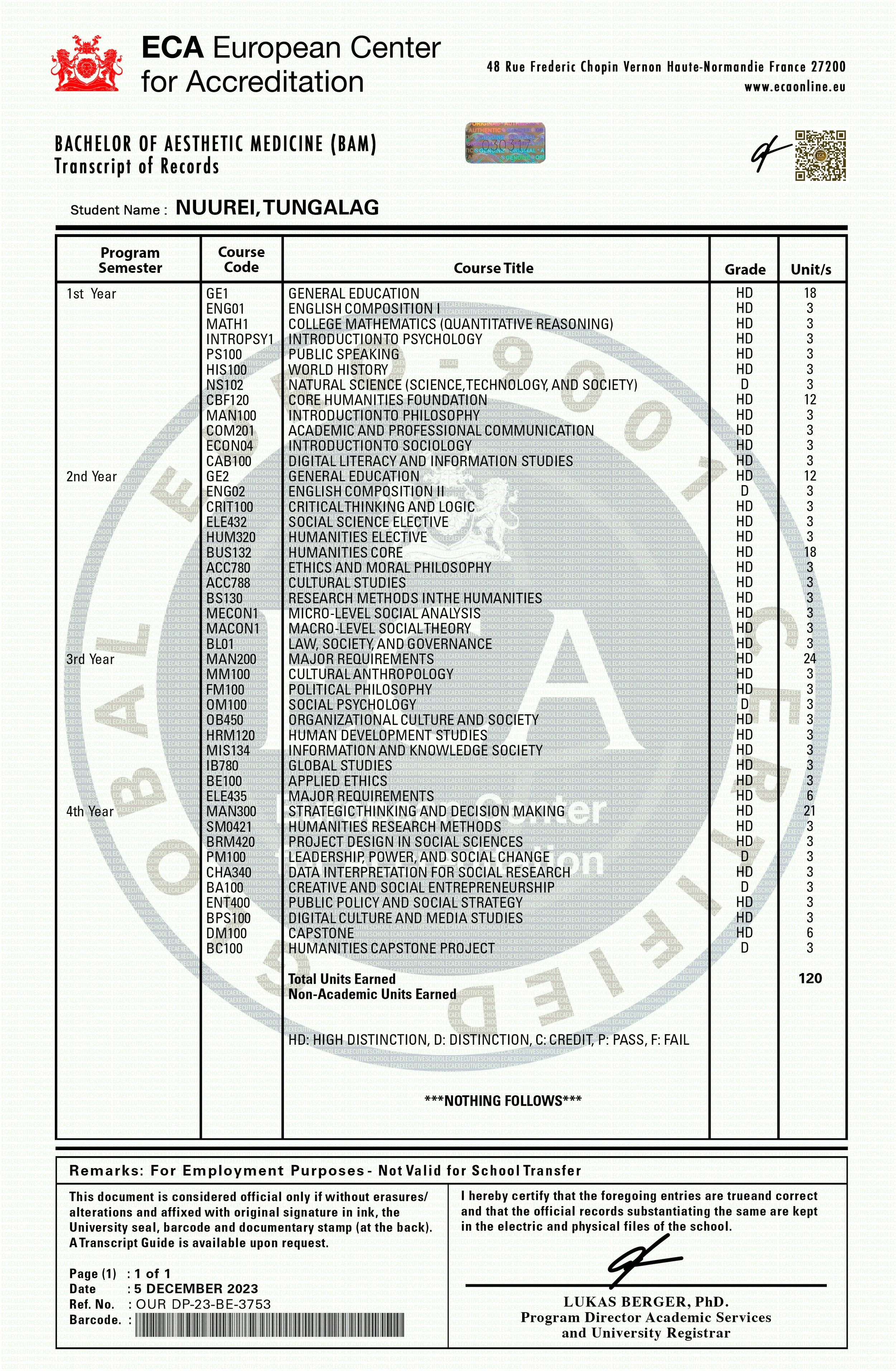 The data provided in this Academic Transcript was processed solely for the purpose of certifying the individual’s satisfactory masteral certification from the European Center for Accreditation & ECA Executive School, in compliance with the EU General Data Protection Regulation (GDPR).