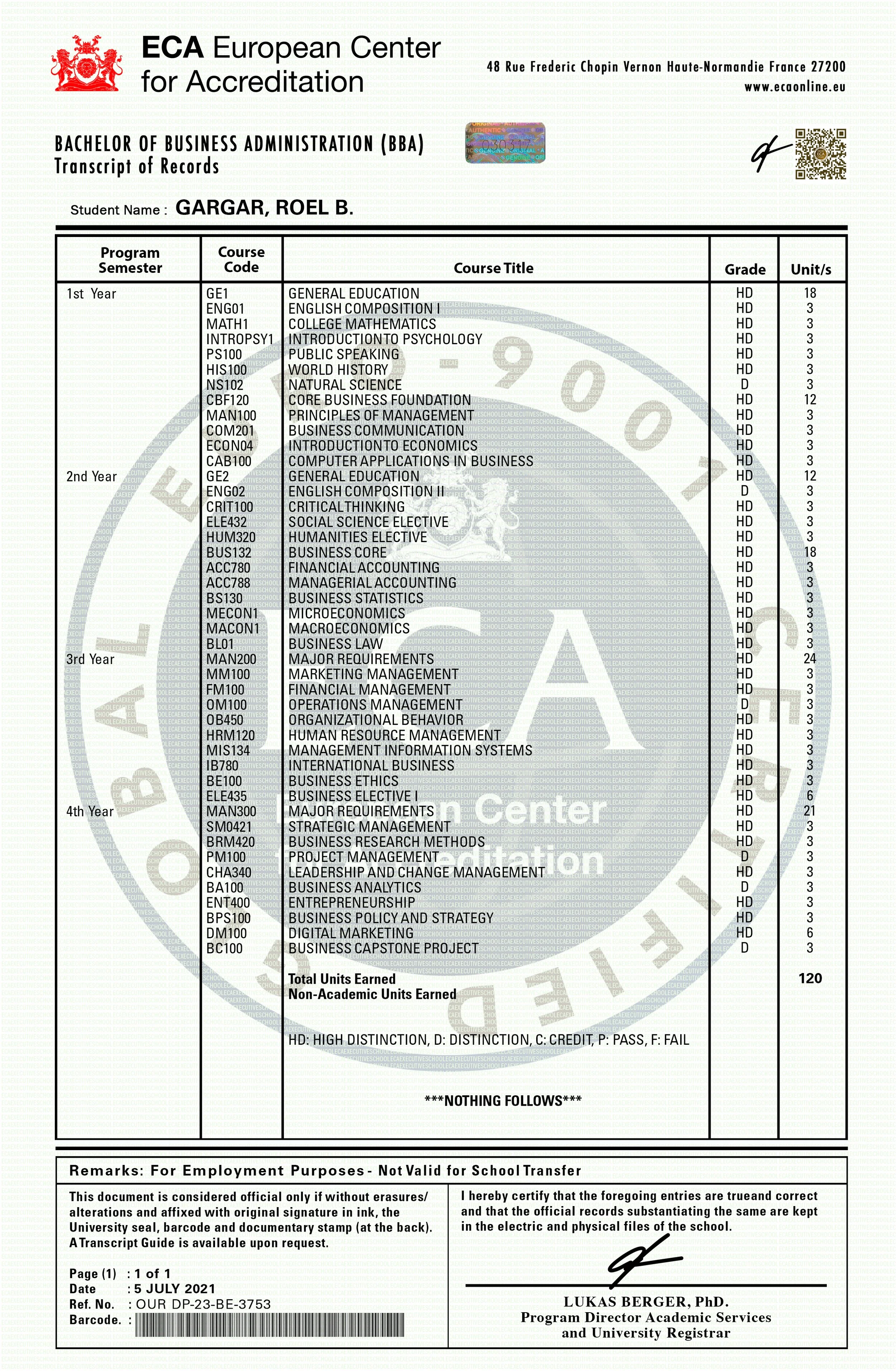 The data provided in this Academic Transcript was processed solely for the purpose of certifying the individual’s satisfactory bachelors certification from the European Center for Accreditation & ECA Executive School, in compliance with the EU General Data Protection Regulation (GDPR).