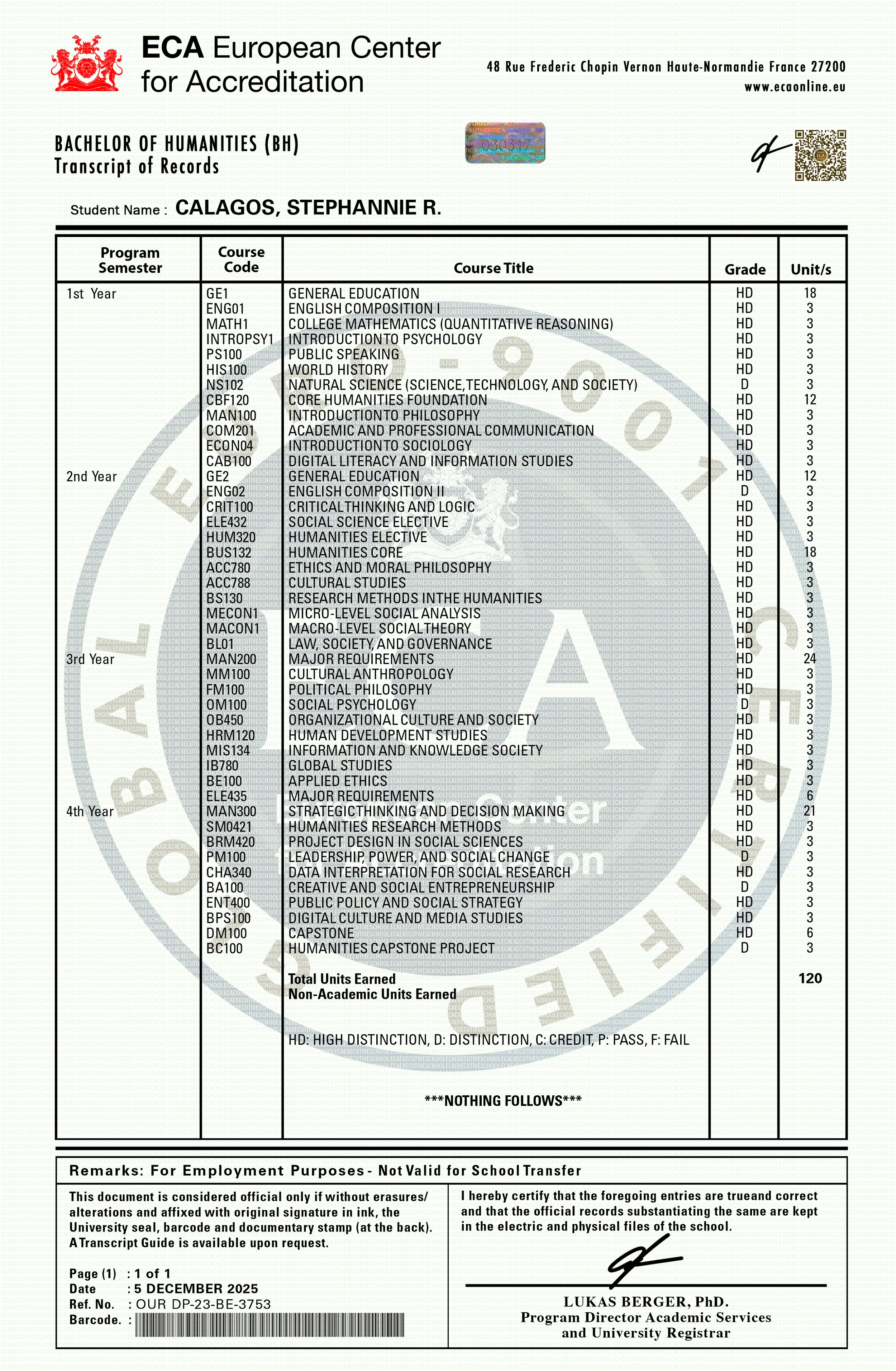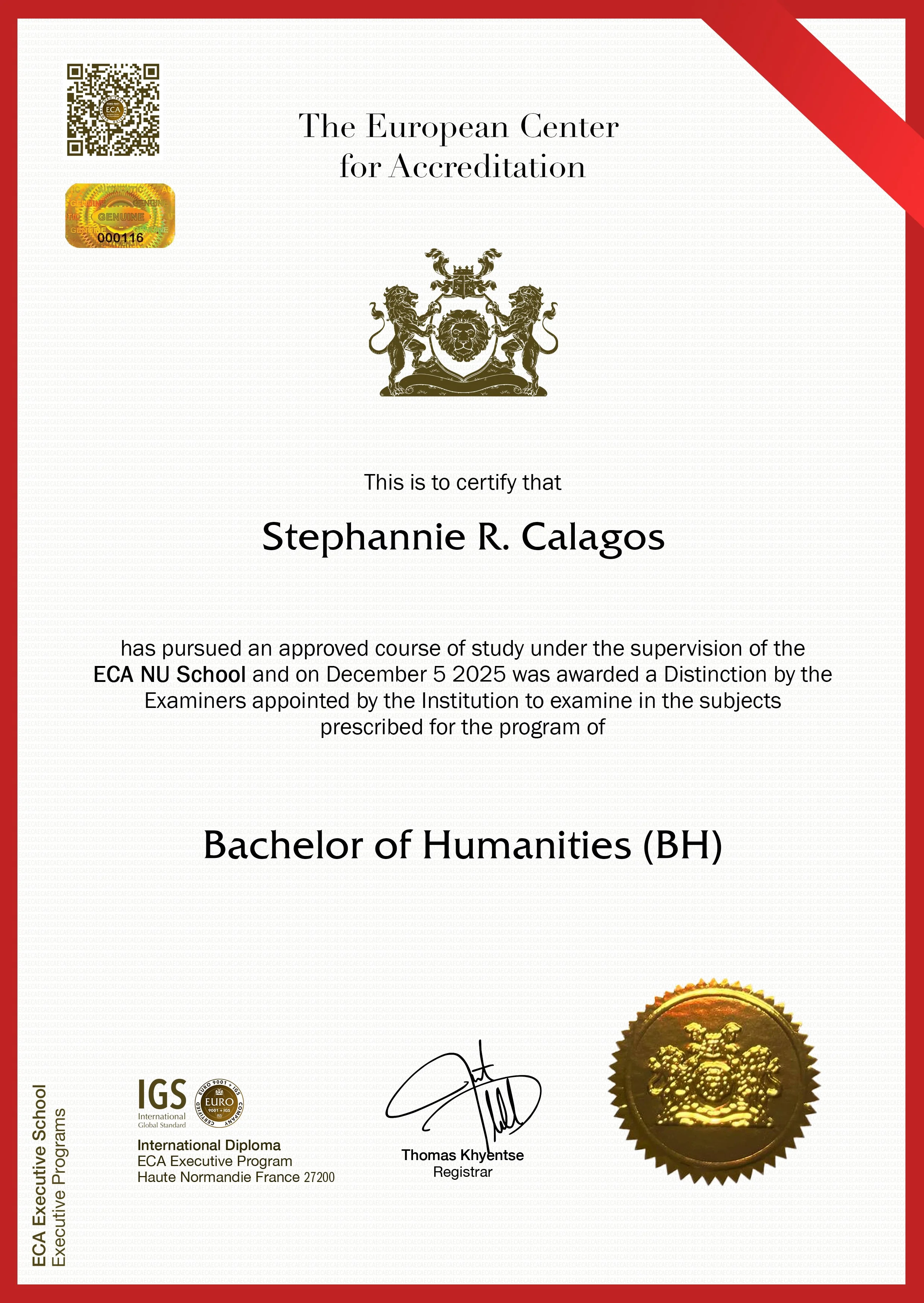 The data provided in this Academic Transcript was processed solely for the purpose of certifying the individual’s satisfactory bachelors certification from the European Center for Accreditation & ECA Executive School, in compliance with the EU General Data Protection Regulation (GDPR).