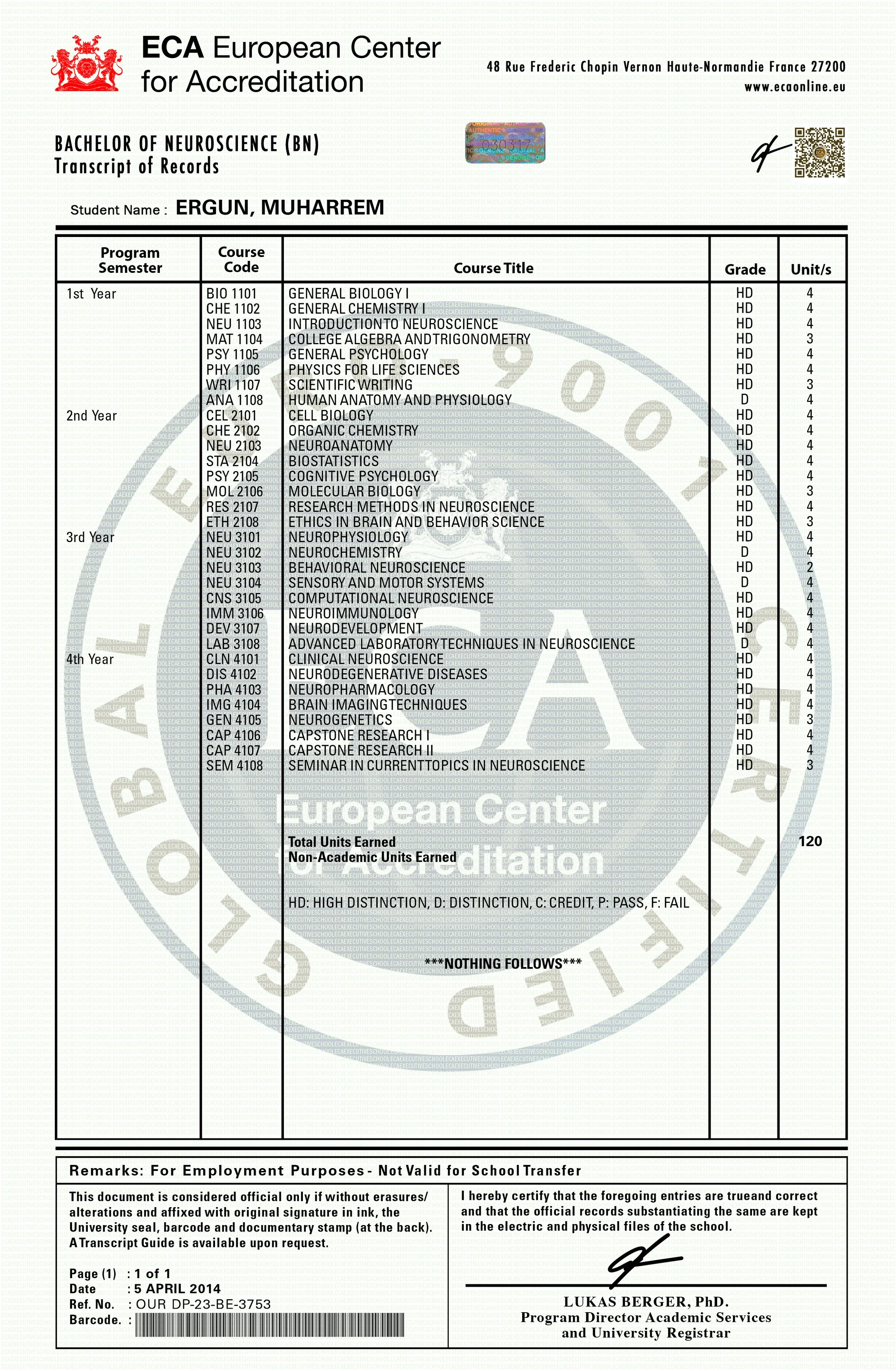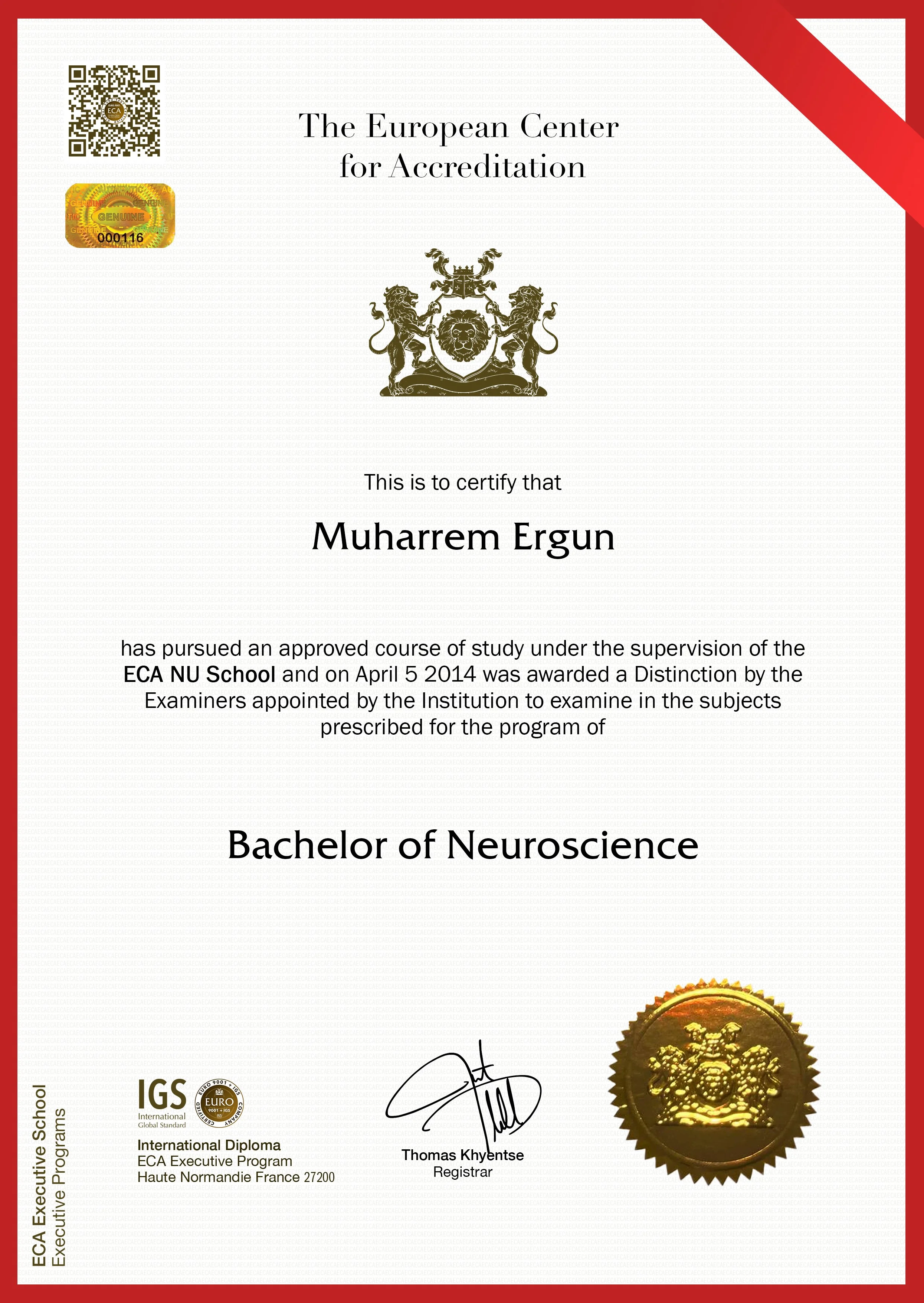 Cette personne a satisfait aux epreuves des quartre unites de controle de la serie, et devient titulaire de plein droit du Diplome Bachelor de Neurosciences, fait a etat Paris, France, Annee 2014.