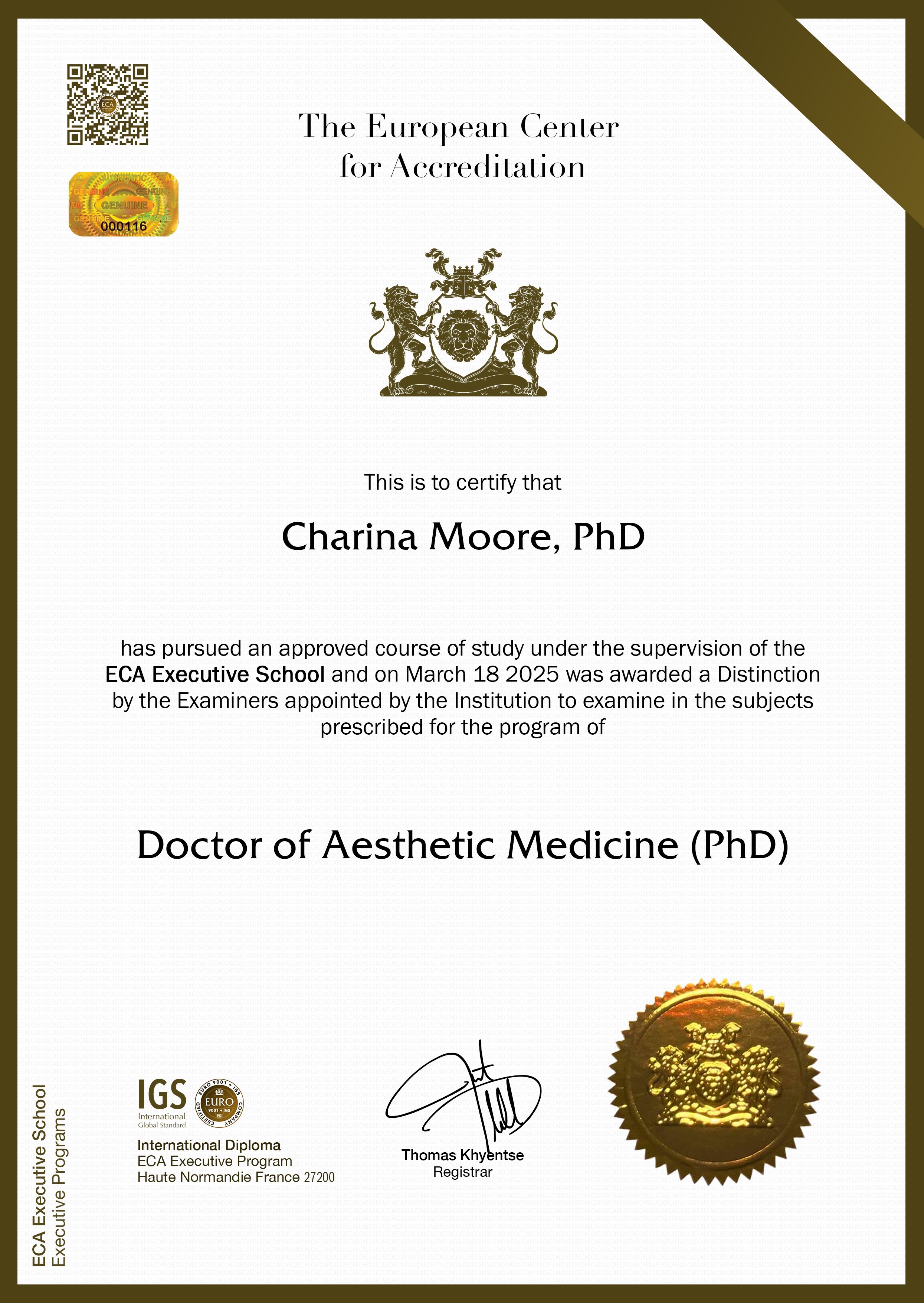 Cette personne a satisfait aux epreuves des quartre unites de controle de la serie, et devient titulaire de plein droit du Diplome Doctorat de Médecine Esthétique, fait a etat Paris, France, Annee 2025.