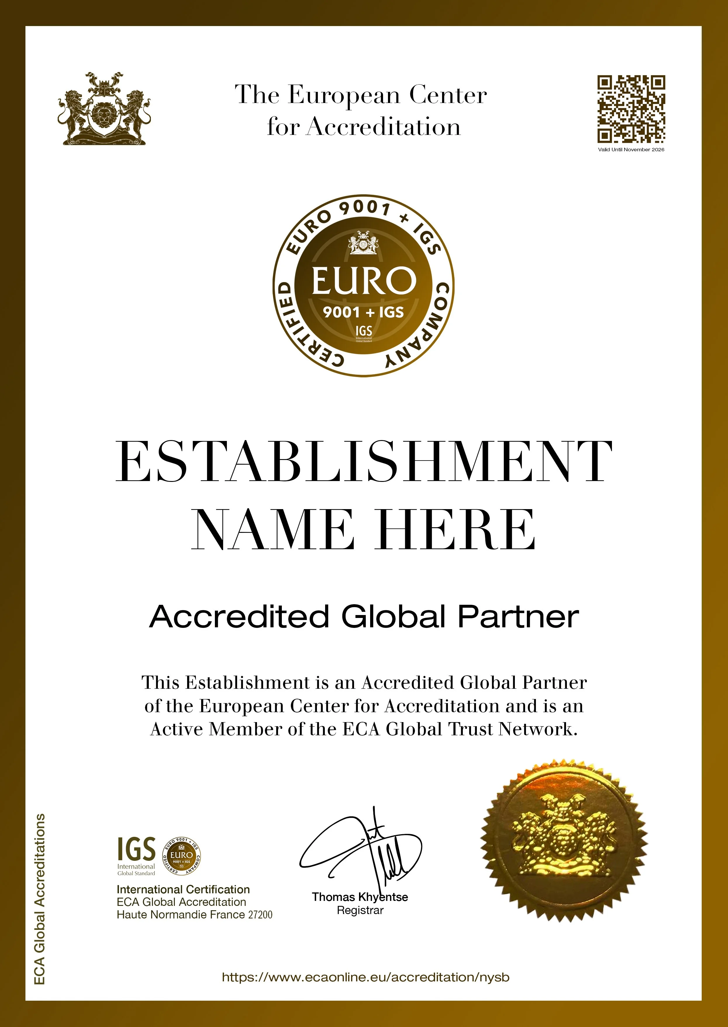 About the Certification À Propos Du Certification | The European Center for Accreditation (ECA) is the world’s leading provider of online accreditation and certification programs for businesses and key service institutions. ECA is also the Official Provider of the IGS International Global Standard and EURO Certifications to institutions worldwide.