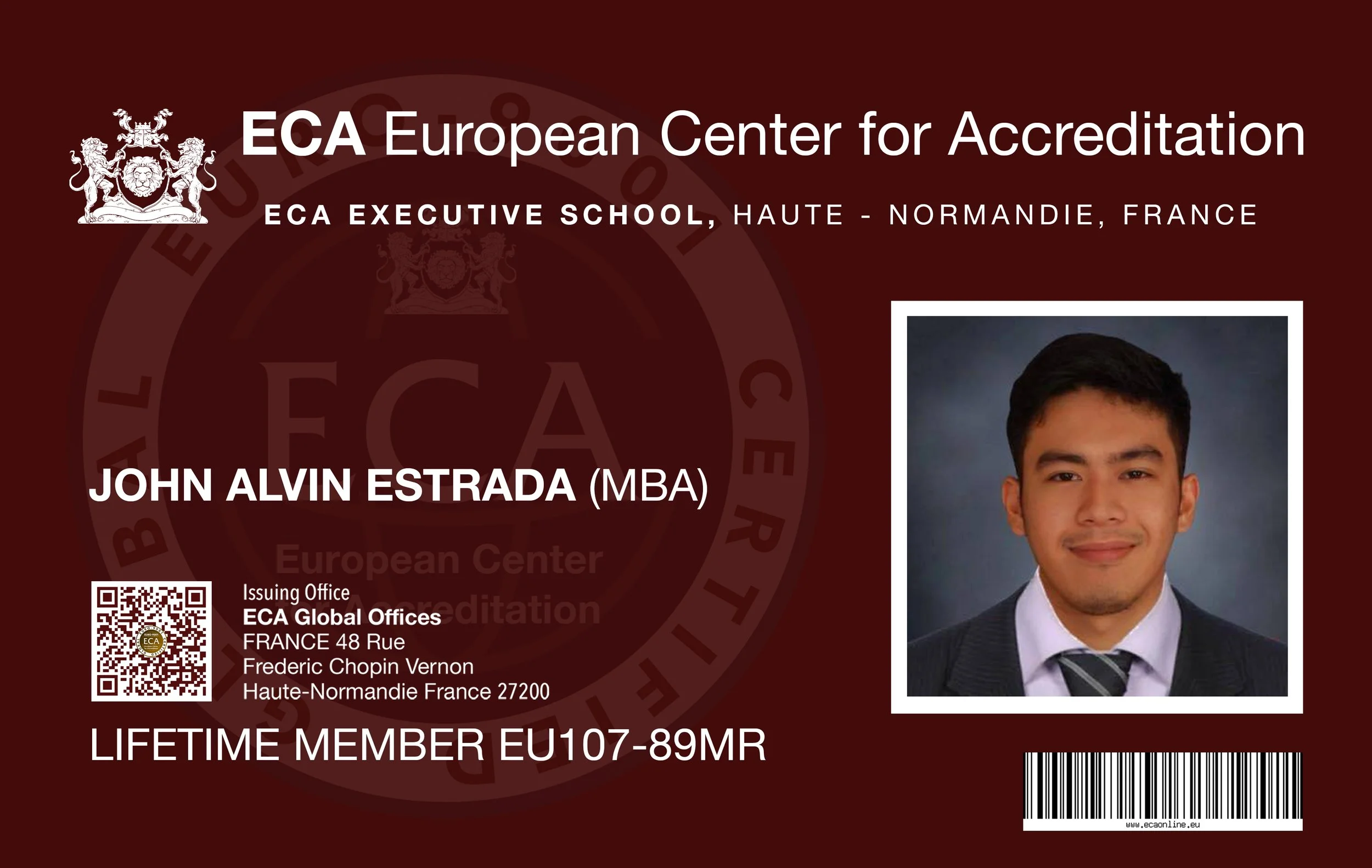 The data provided in this Academic Transcript was processed solely for the purpose of certifying the individual’s satisfactory masteral certification from the European Center for Accreditation & ECA Executive School, in compliance with the EU General Data Protection Regulation (GDPR).