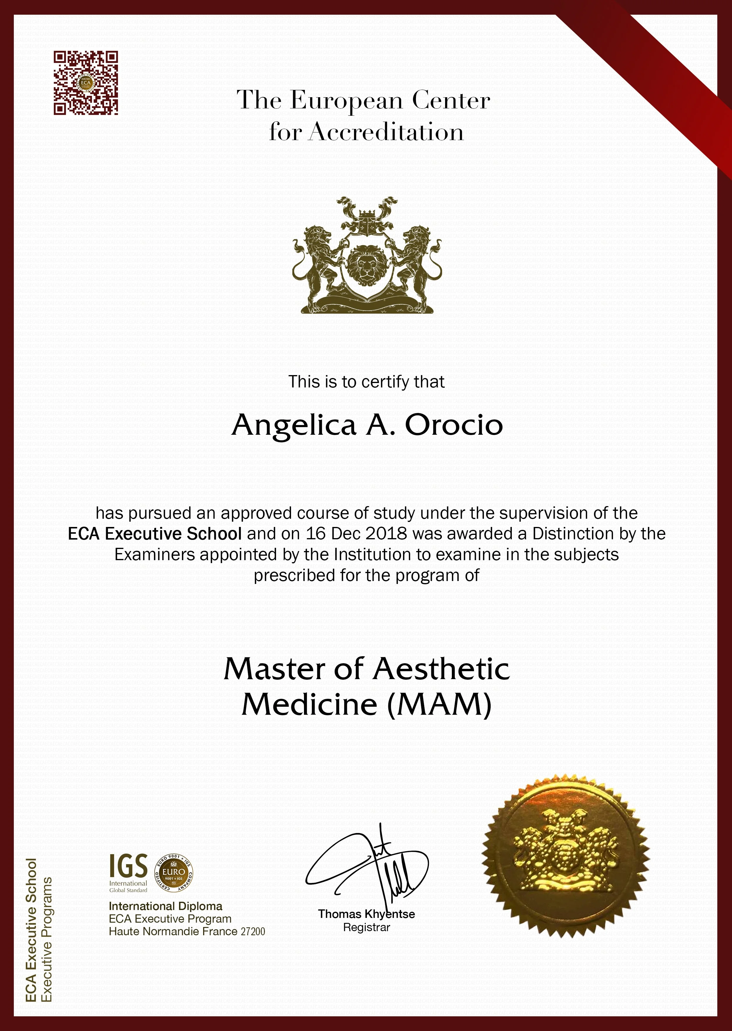 Cette personne a satisfait aux epreuves des quartre unites de controle de la serie, et devient titulaire de plein droit du Diplome Master de Médecine Esthétique, fait a etat Paris, France, Annee 2018.