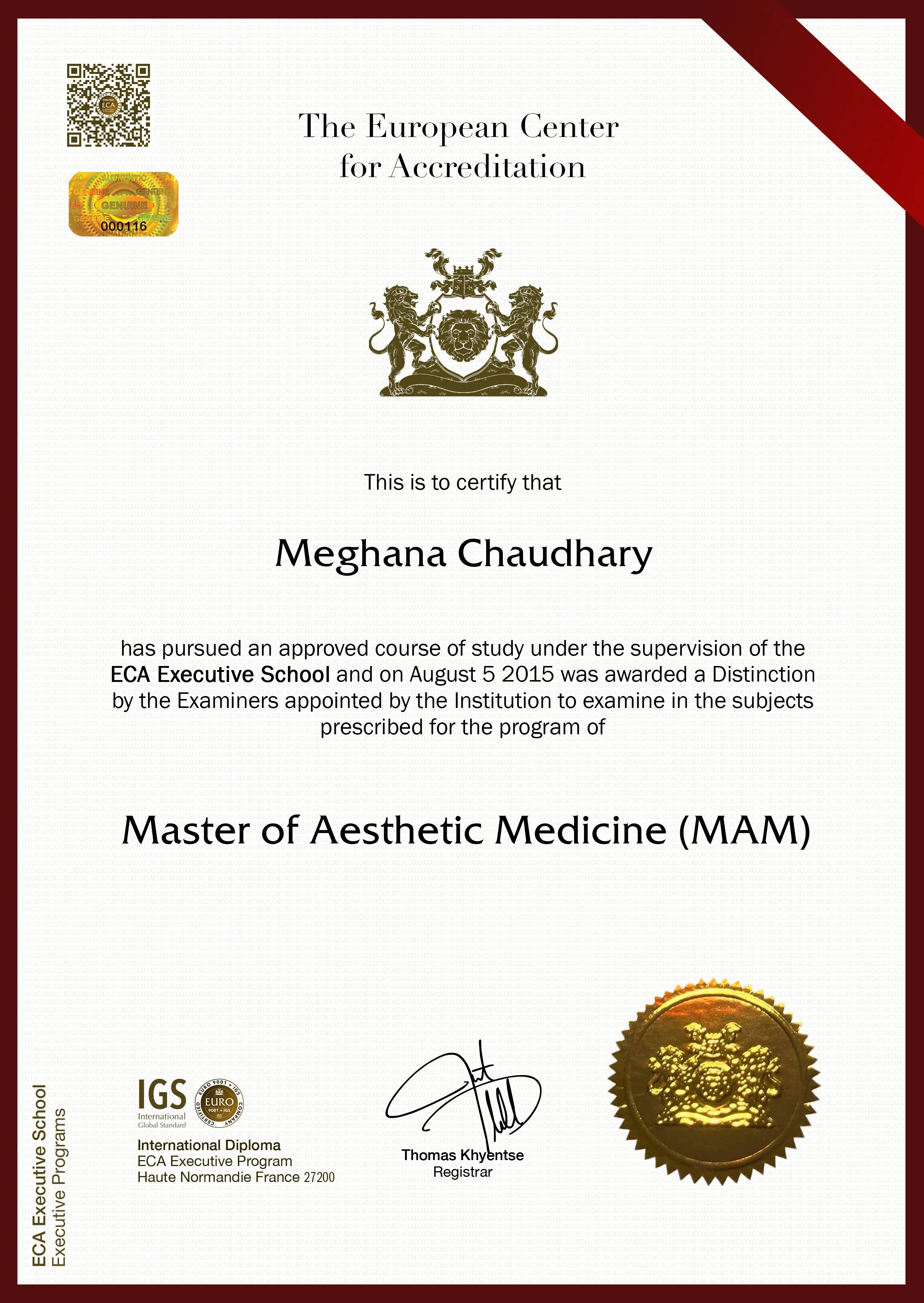 Cette personne a satisfait aux epreuves des quartre unites de controle de la serie, et devient titulaire de plein droit du Diplome Master de Médecine Esthétique, fait a etat Paris, France, Annee 2015.