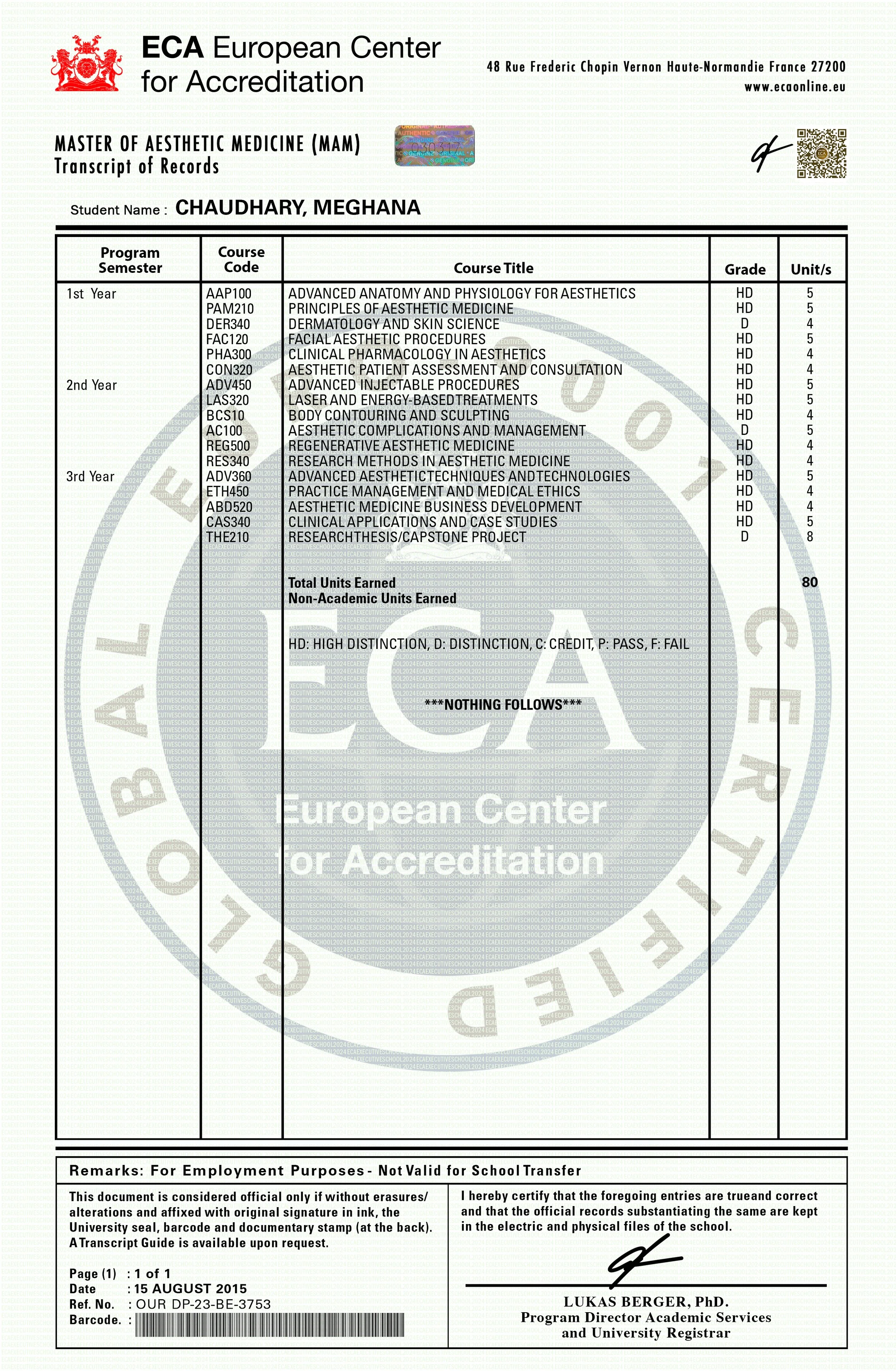 The data provided in this Academic Transcript was processed solely for the purpose of certifying the individual’s satisfactory masteral certification from the European Center for Accreditation & ECA Executive School, in compliance with the EU General Data Protection Regulation (GDPR).