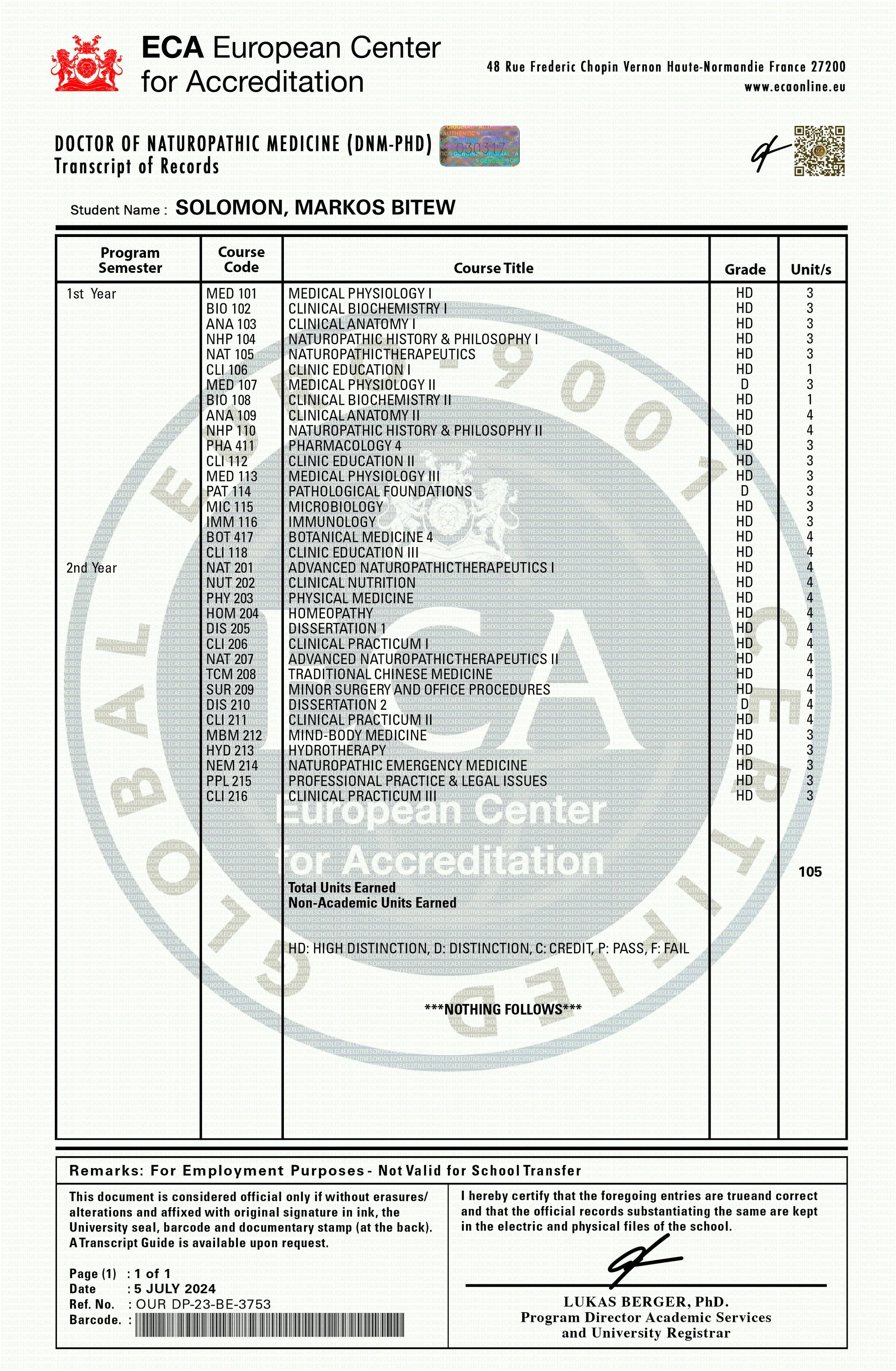 Cette personne a satisfait aux epreuves des quartre unites de controle de la serie, et devient titulaire de plein droit du Diplome Doctorat de Médecine Naturopathique, fait a etat Paris, France, Annee 2024.