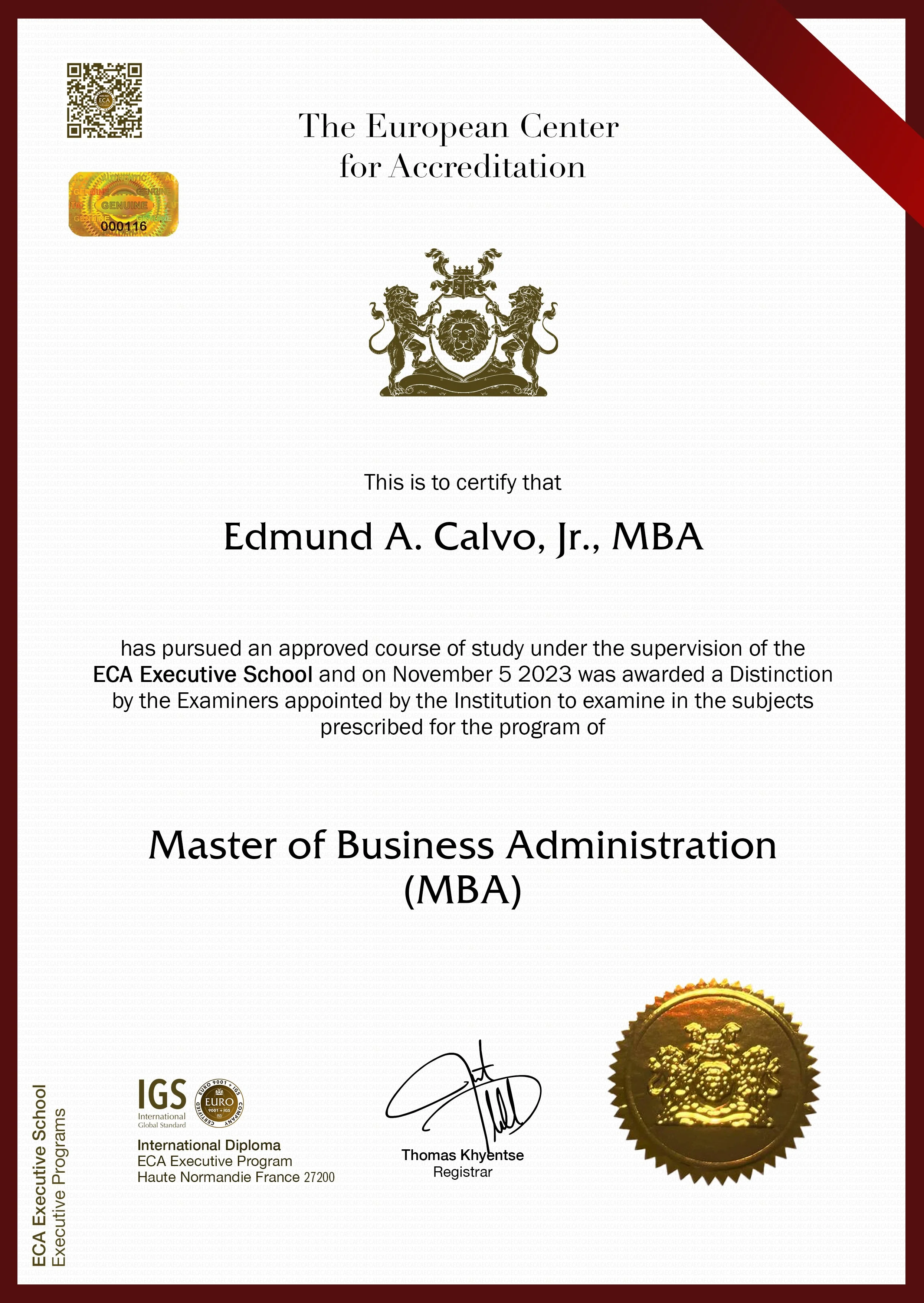 The data provided in this Academic Transcript was processed solely for the purpose of certifying the individual’s satisfactory masteral certification from the European Center for Accreditation & ECA Executive School, in compliance with the EU General Data Protection Regulation (GDPR).