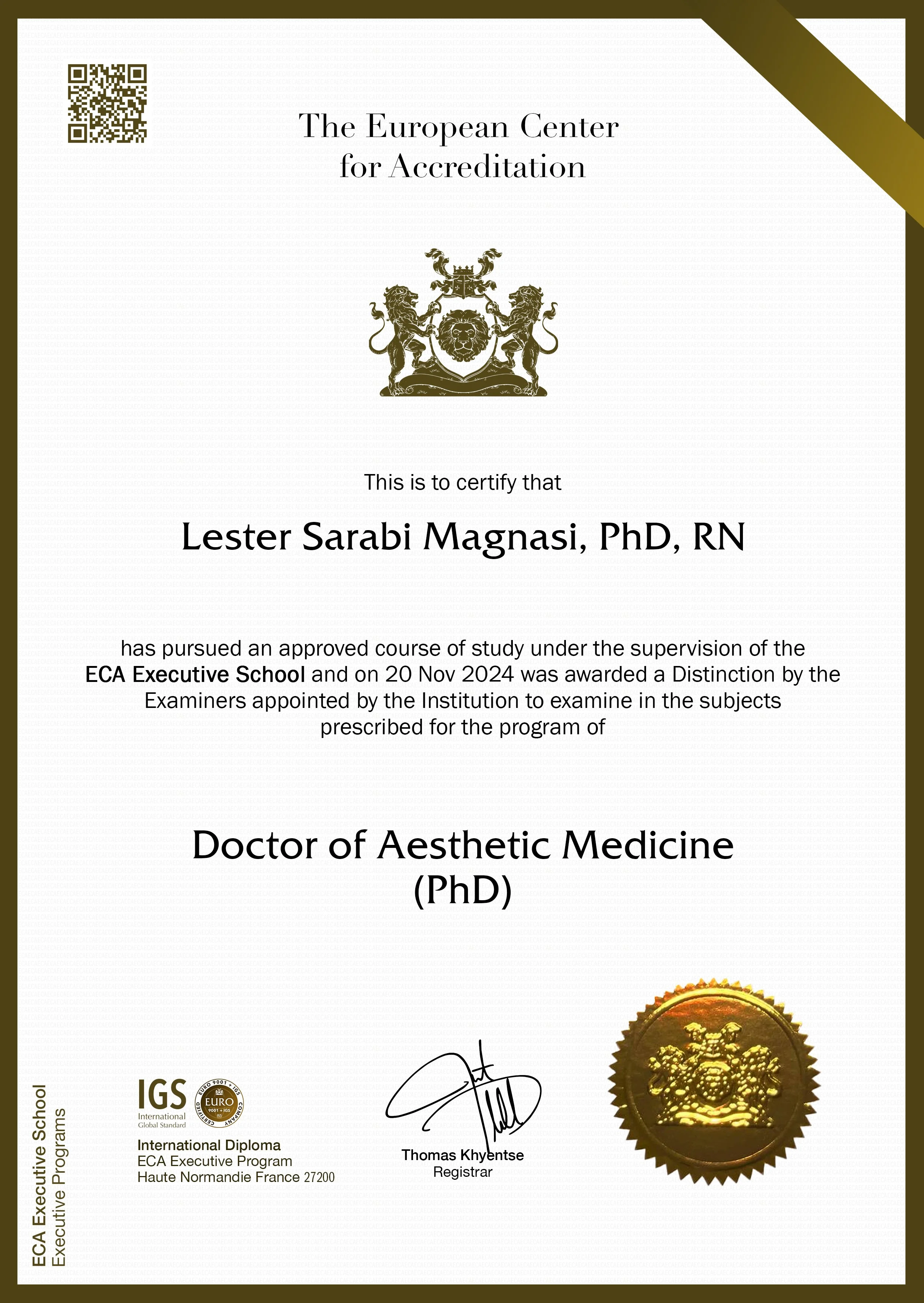 The data provided in this Academic Transcript was processed solely for the purpose of certifying the individual’s satisfactory doctorate certification from the European Center for Accreditation & ECA Executive School, in compliance with the EU General Data Protection Regulation (GDPR).