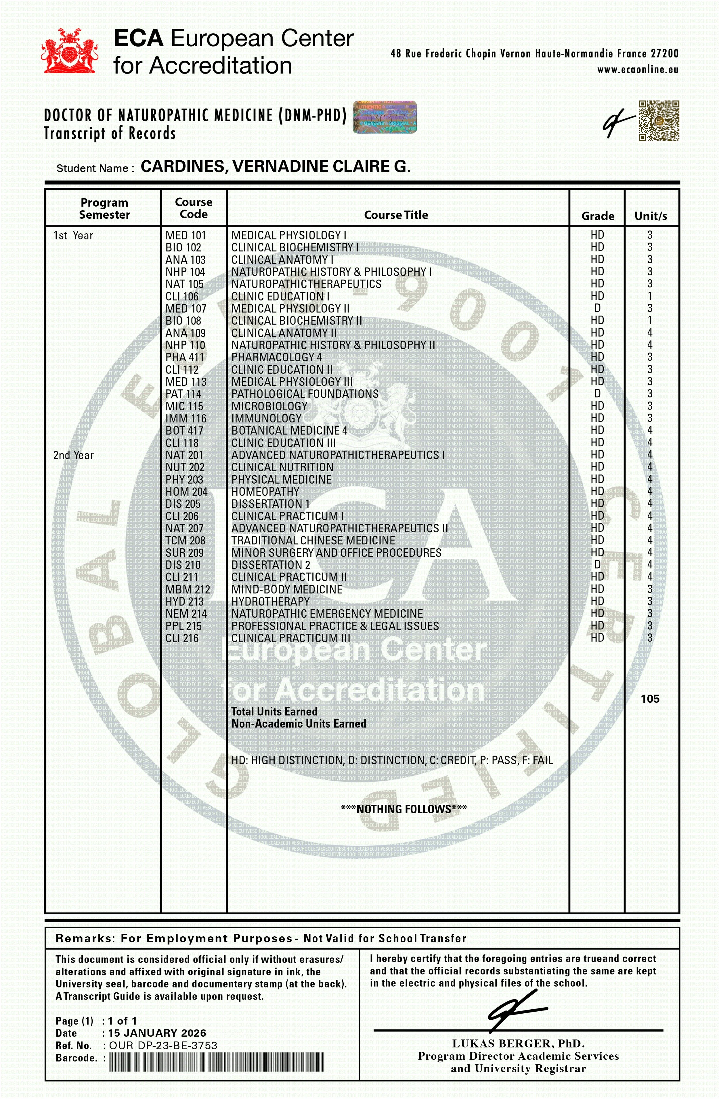 Cette personne a satisfait aux epreuves des quartre unites de controle de la serie, et devient titulaire de plein droit du Diplome Doctorat de Médecine Naturopathique, fait a etat Paris, France, Annee 2026.